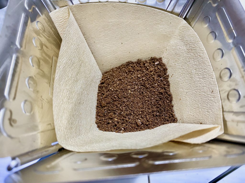 ⇧早速ハンドミルで挽いたコーヒ粉をドリッパーに入れてみました。型紙に合わして折らなくてもしっかりフィット。